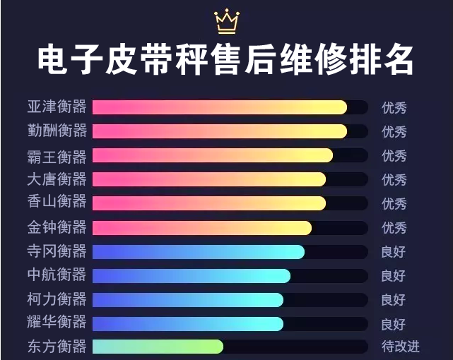 從給出的榜單可以看到,電子皮帶秤售后服務(wù)優(yōu)秀的前2個(gè)品牌為亞津衡器和勤酬衡器分別以相同的得分并列第一。而服務(wù)最差的是東方衡器,這也充分的說明了目前東方衡器的銷量在國內(nèi)也不是很樂觀。